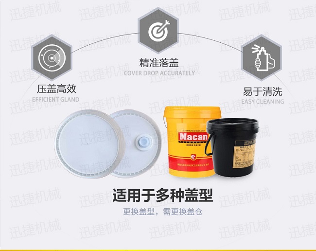 人工放蓋至料倉——自動剝離——自動吸蓋——自動掛蓋——自動滾壓蓋——自動出桶——一個循環完成。