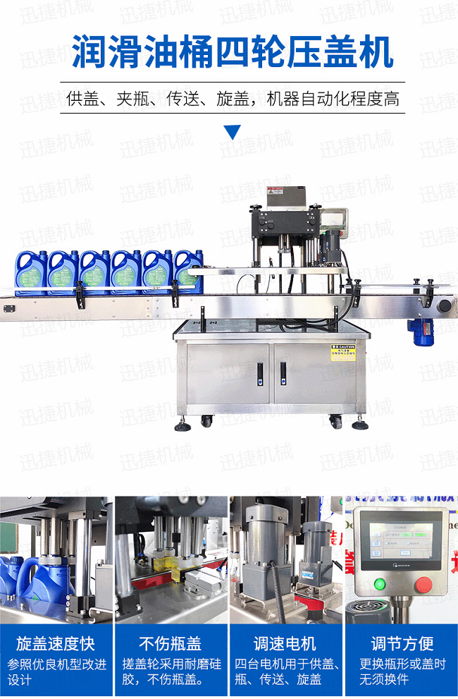 潤滑油灌裝旋蓋機生產線適用于1-10升通用型號,廣泛用于花生油、豆油、芝麻油、橄欖油等液體包裝行業的必備用品。機器采用流量計計量,觸摸屏控制,參數一鍵調整,方便快捷??梢怨嘌b各種油脂,油料。灌裝頭采用專用的油脂防滴漏灌裝頭,不滴漏。機器設定有快慢速技術,可以先快后慢,防止物料噴濺。保持生產車間干凈潔凈。