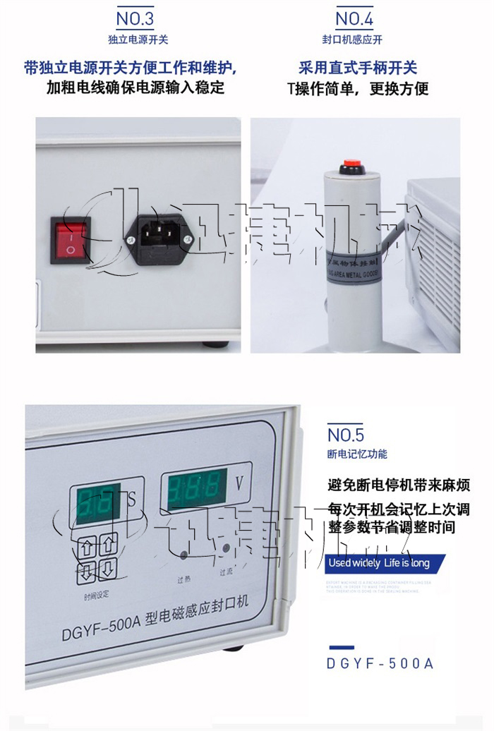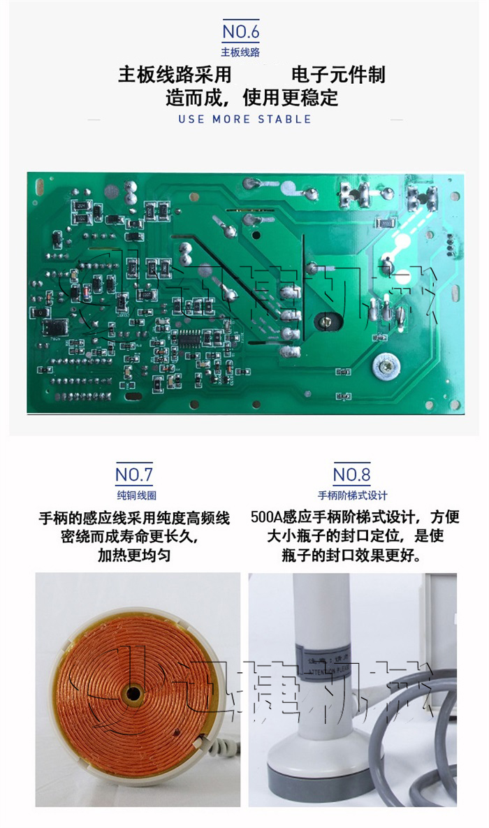 本手持式電磁感應(yīng)鋁箔封口機(jī)是利用電磁感應(yīng)的原理,將瓶口上的鋁箔片瞬間產(chǎn)生高熱,然后熔合在瓶口上,使達(dá)到封口的功能。具有良好的防潮、防霉、防偽作用,起到延長物品保存周期的目的。封口容器的材質(zhì)可以是聚乙(PE)、聚丙烯(PP)、聚酯(PET)、聚苯乙烯(PS)、ABS以及玻璃等,不能用于金屬瓶體及瓶蓋。(本公司同時提供各種材料感應(yīng)鋁箔膜)。